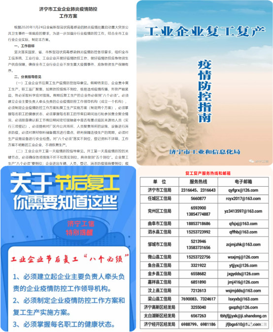 二、科学生产,有序复工 市工信局第一时间出台《济宁市工业企业新型冠状病毒感染的肺炎疫情防控工作方案》,组织7个督导组赴各县市区进行实地督导调研,重点调研春节期间未停产企业落实防疫措施情况、各县市区组织工业企业复工生产的计划打算和各县市区工信部门开展疫情防控的经验做法和存在问题。指导企业严格落实主体责任,高度重视企业职工假期期间的身体状况、出行状况排查,切实做好疫情防控期间工业企业“八个必须”、“五个到位”、“四个坚持”,严格按照属地疫情防控指挥部的安排做好防控措施落实。