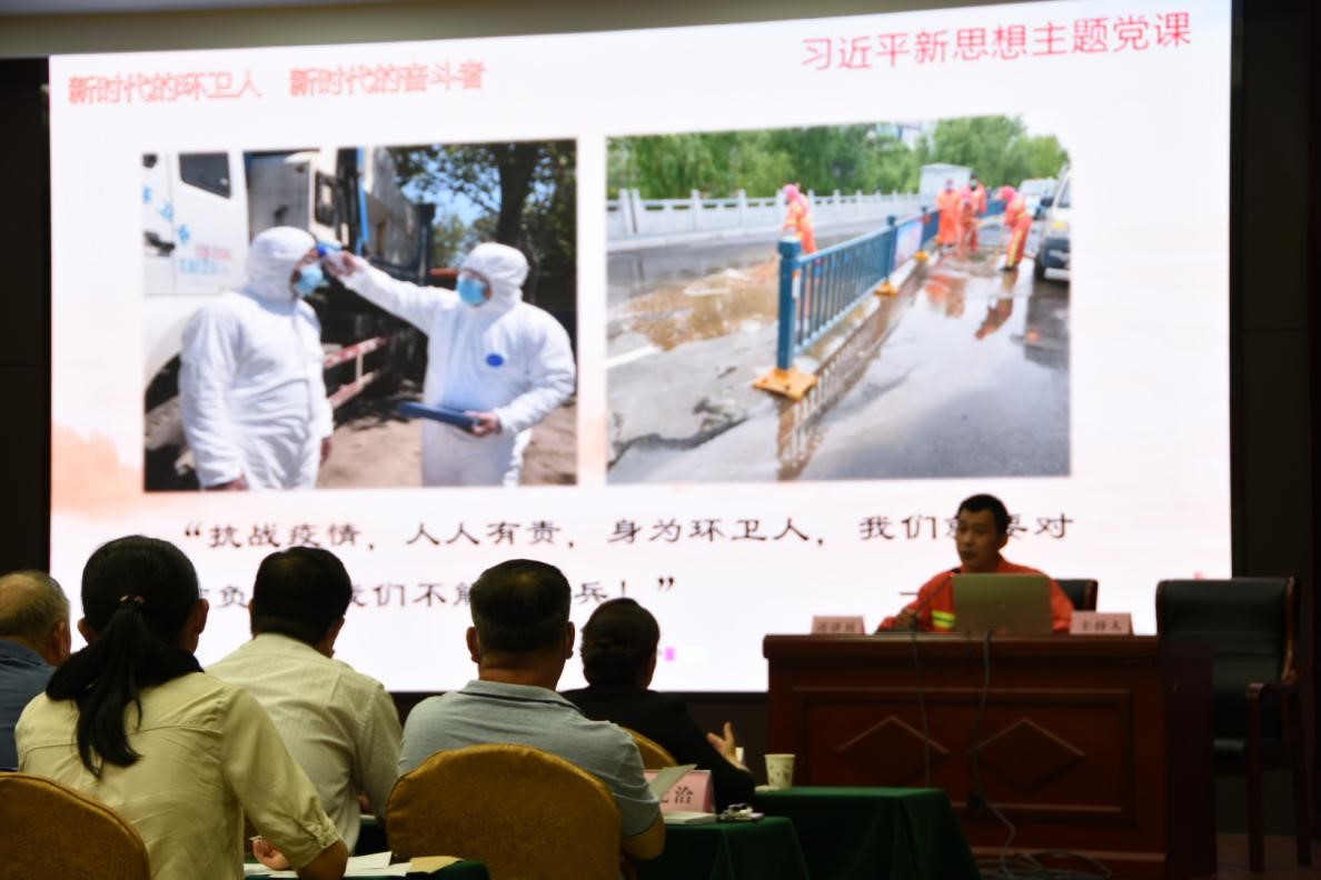 贾磊带来的微党课是《新时代的环卫人、新时代的奋斗者》。他结合自身工作实际,将习近平新时代中国特色社会主义思想运用到环卫工作中,讲述了环卫工作者的坚守和奉献。