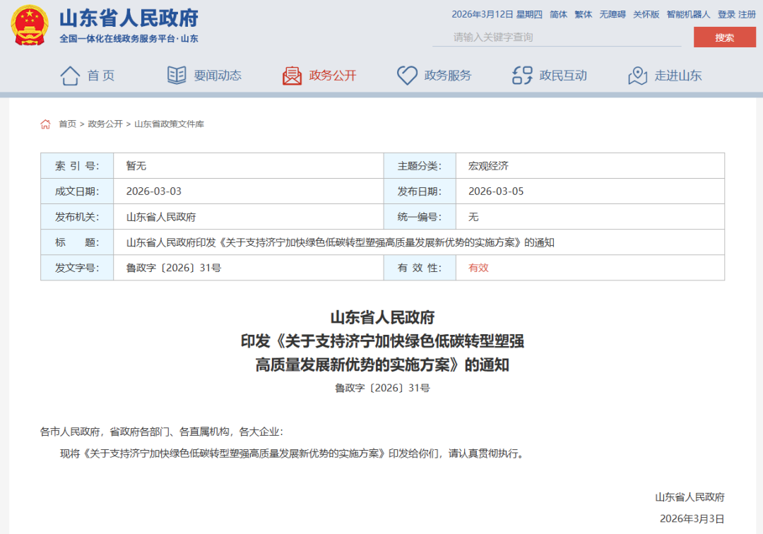 山东省人民政府印发《关于支持济宁加快绿色低碳转型塑强高质量发展新优势的实施方案